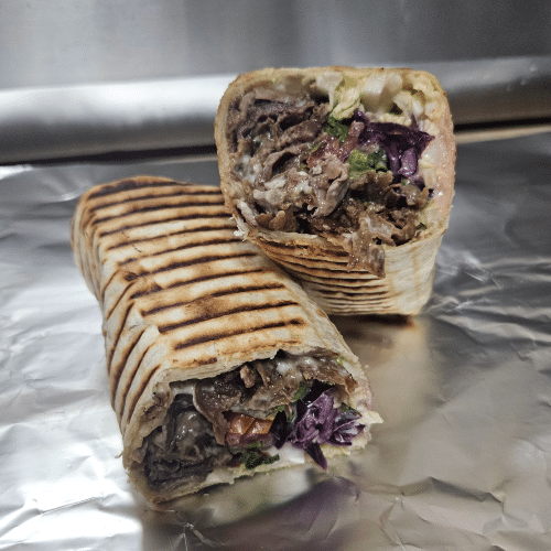 grillowane warzywa, frytki, cheddar, świeża sałatka, sos miętowo-kolendrowy, pasta czosnkowa